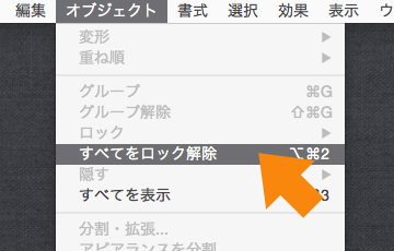 メニューの「オブジェクト」から、「すべてのロックを解除」をクリックします。これで、ロックが解除された状態になりました。